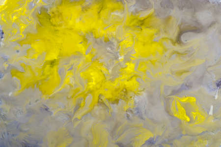 Trending colors of 2021. Yellow bubbles drops on gray flow of paint. Marble effect background or texture. Fluid Art