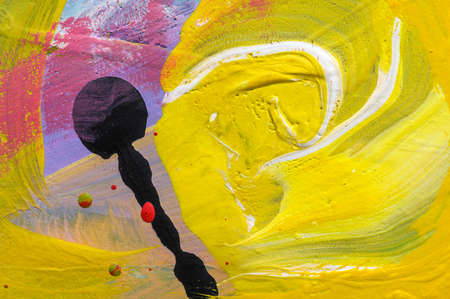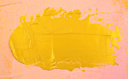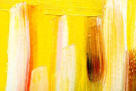Macro strokes of yellow acrylic paint on white textured drawing paper