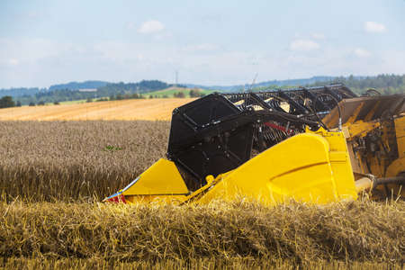 Yellow harvester automatic combine on field harvesting wheat in summer. Agriculture harvesting concept