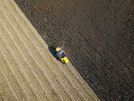 Aerial view of Yellow combine harvesting on the corn field