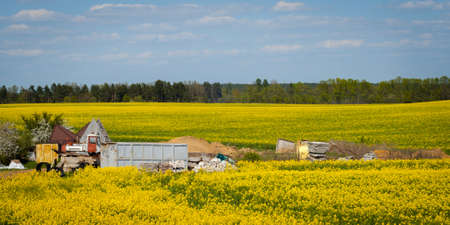 Creative spring agricultural landscape. blooming rapeseed field with construction waste and old discarded agricultural machinery with a forest belt in the background under a blue sky in fine weather