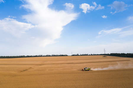 Aerial view of combine harvester working on the large wheat field