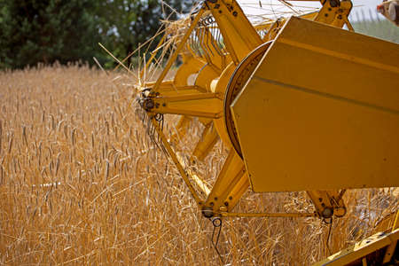 standing combine harvester harvesting ripened wheat on a sunny day. agriculture
