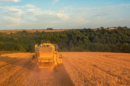 Rear aerial shot of a Combine Harvester harvesting a wheat field at Sunset in the UK