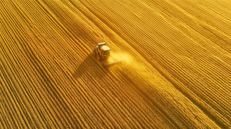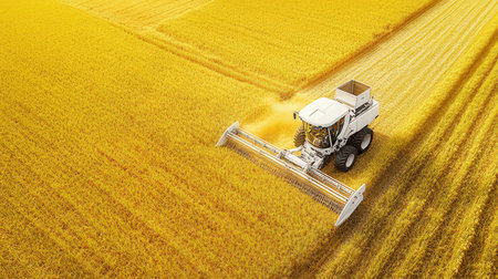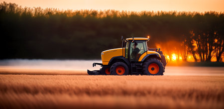 A combine harvester or agricultural tractor is processing or harvesting wheat in a field in the afternoon at sunset. Generative AI