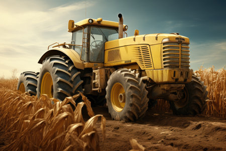A big tractor in corn field, combine harvester harvests ripe, Ai generated