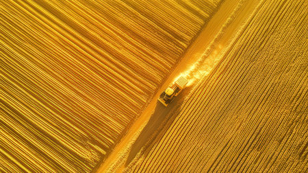 Aerial top view of wheat harvesting. Combine harvester working on golden wheat field. Agricultural business, agronomy, machinery, soil fertilisation, organic plant protection. Background copy space
