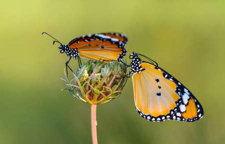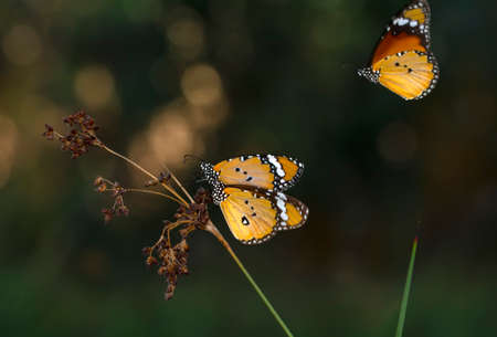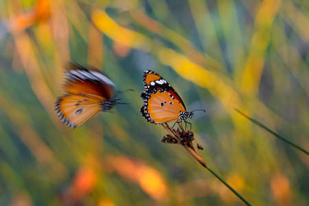 Beautiful monarch butterflies, Danaus chrysippus flying over summer flowers