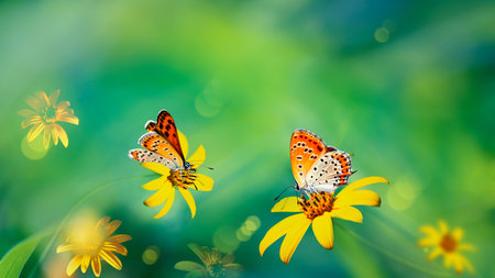 Orange butterflies on yellow flowers in a garden. Summer wonderland.