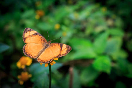 Close up nature view of beautiful orange butterfly on green blurred background in garden with copy space using as background insect, natural landscape, ecology, fresh cover page concept.