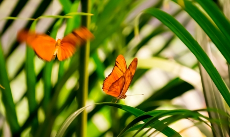 Two Julia Butterflies in a butterfly house One is resting on a leaf while the other is flying towards him