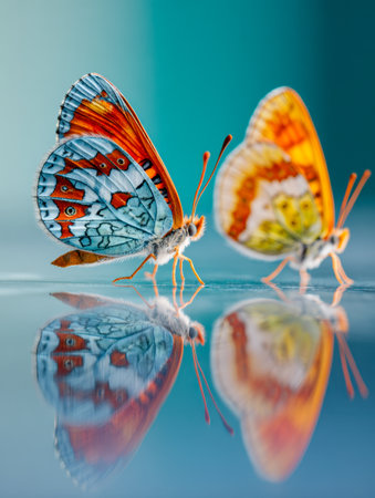 Delicate orange and azure butterflies rest gently on a mirror-like surface, set against a tranquil turquoise hue that evokes calmness and natural elegance.