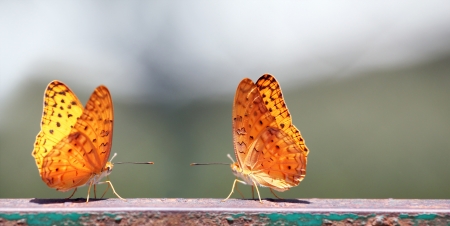 Pair of butterflies with yellow spotted wings sitting next to each other romantically on a summer noon.