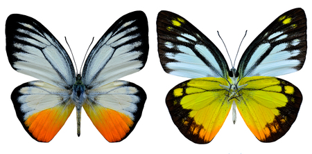 Two beautiful yellow butterflies. Orange Vindula erota isolated on white background. Butterfly with spread wings and in flight.