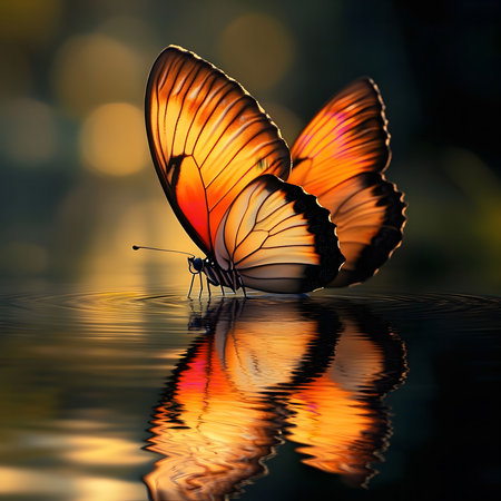 A golden butterfly gently rests on calm water, its reflection mirroring its beauty. Sunset colors bathe the scene.