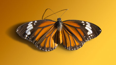 Orange butterfly close up detailed image isolated on orange background.
