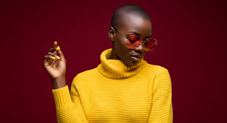 stylish african american woman in yellow sweater and sunglasses isolated on red