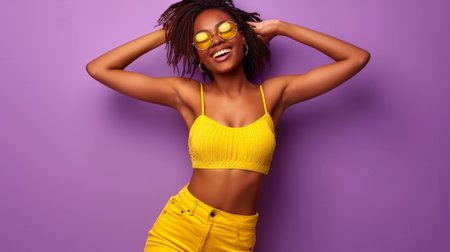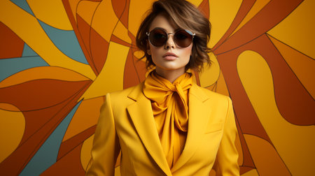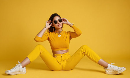 A stylish young woman poses confidently in a bright yellow sweater and trendy sunglasses. This vibrant image captures the essence of summer style and playful fashion.