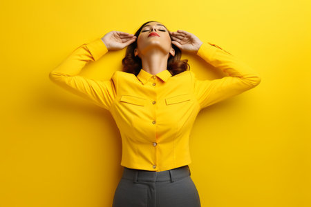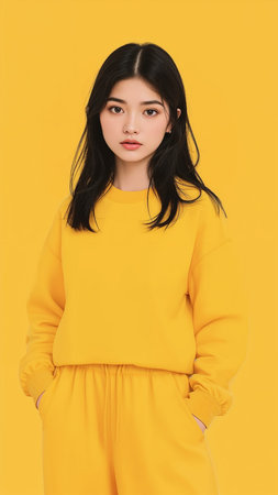 Young woman wearing a matching yellow sweatshirt and pants, standing confidently against a bright yellow backdrop. Minimalist and monochromatic style.