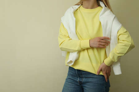 Close up of woman's hands of unrecognizable person in pockets of yellow hoodie on gray brick background. Front view on body part of young female in sweatshirt