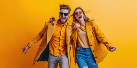 Trendy young couple in athleisure wear, pose against a vibrant yellow studio backdrop