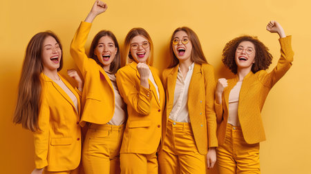 A lively group of five women dressed in matching yellow suits joyfully celebrate together against a bright yellow backdrop, showcasing their friendship and enthusiasm.