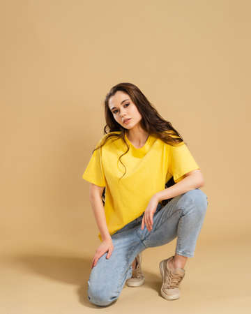 Young beautiful girl with long curly hair in a yellow t-shirt stands on one knee on a pastel orange studio background.