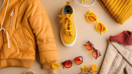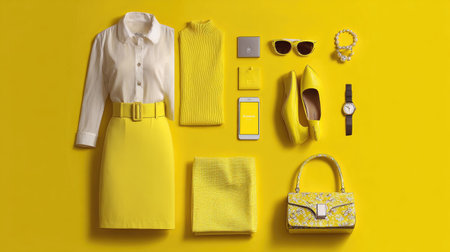 A vibrant flat lay featuring a stylish yellow outfit and trendy accessories arranged artistically against a bright yellow background. Perfect for fashion inspiration.