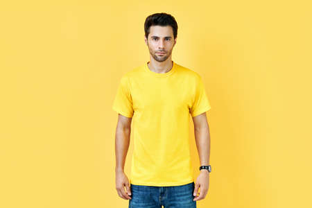 Mockup of yellow cotton T-shirt. Teenage girl in yellow T-shirt on yellow background. T-shirt mockup for design promotion