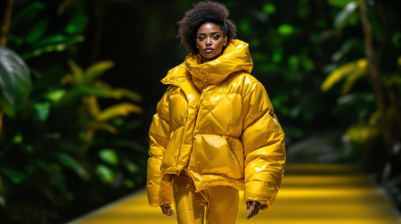 Fashionable woman in bright yellow winter jacket on jungle-themed runway.