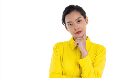a young woman in a yellow shirt is thoughtfully posing with her hand on her chin against a white background in a studio shot. she is looking forward