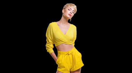 A confident young Indian supermodel woman in a cropped yellow top, white shorts, and fashionable accessories strikes a striking pose.