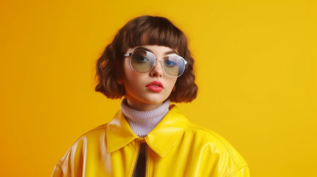 Fashionable young short hair woman in stylish glasses carrying trendy bag against yellow background : Generative AI