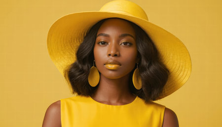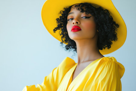 A stylish woman in a yellow dress and hat, with red lipstick, poses confidently against a clean white backdrop.