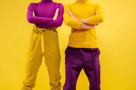 Cropped shot of two stylish dressed people standing with their arms crossed