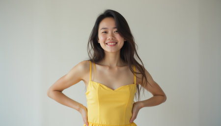 A radiant young woman with long dark hair smiles brightly while wearing a vibrant yellow dress, exuding joy and confidence. The soft, neutral background enhances her cheerful demeanor, making the image perfect for conveying positivity and warmth.