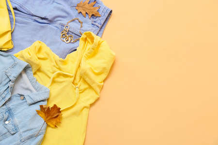 Stylish female shirt, pants, bags and autumn leaves on light background