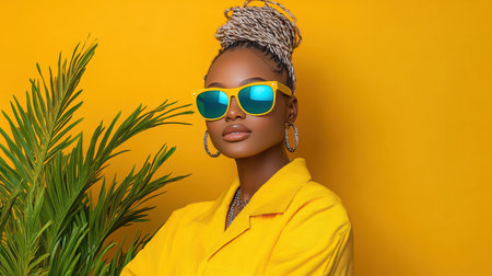 A stylish woman wearing yellow sunglasses poses confidently with plant