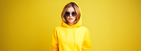 Fashion style image of girl in an yellow sweatshirt wear sunglasses on yellow background.