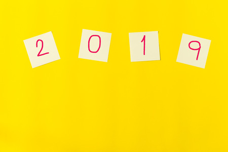 flat lay note papers with 2019 on yellow background with copy space, office and education concept