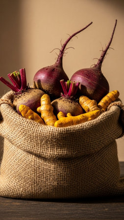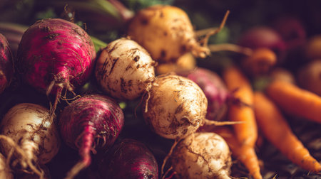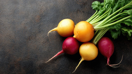 A vibrant collection of fresh organic root vegetables including radishes and turnips, perfect for healthy cooking and nutrition-themed projects on a rustic background.