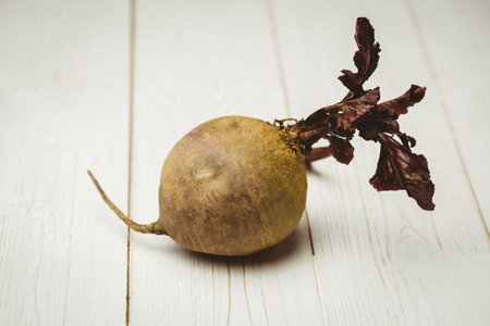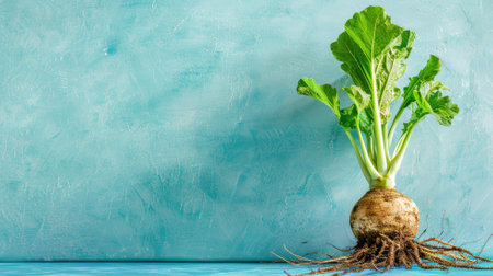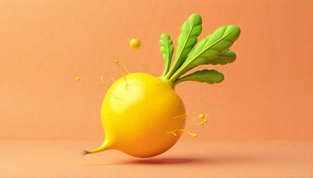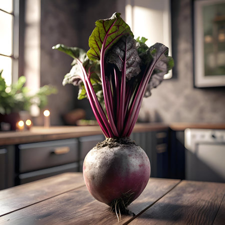 A close up 3D render of a fresh beet with vibrant green leaves. sitting on a wooden table. Perfect for showcasing healthy eating. organic food. and kitchen designs.