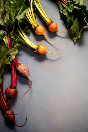 Mix of red and gold beets on grey background. Food background. Concept of healthy eating. Vertical
