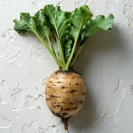 Freshly Harvested Root Vegetable Displayed On Textured Surface Indoors Under Soft Lighting