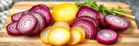 Vibrant variety of sliced beets on a wooden cutting board with fresh herbs