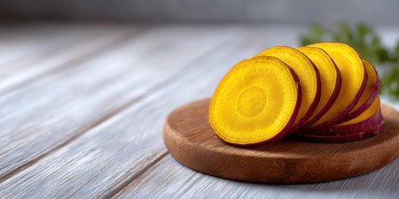 Yellow turnip slices on wooden cutting board with blurred background in natural light