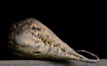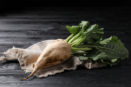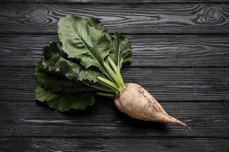Close-up of a fresh sugar beet against dark background on a wooden board with space for text