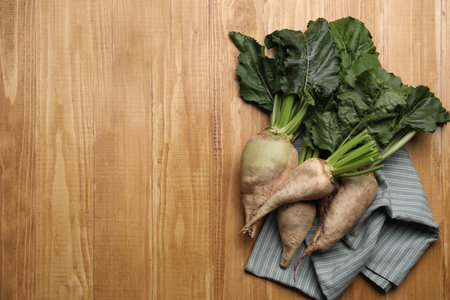 Fresh sugar beets with leaves on wooden table, flat lay. Space for text