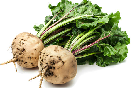 Fresh turnip with leaf, isolate on white background. Macro studio shot. Useful vegetable, dietary vitamin. AI generated.
