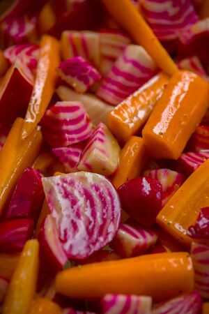 Italian rainbow beetroot Chioggia and carrots ready for roasting.